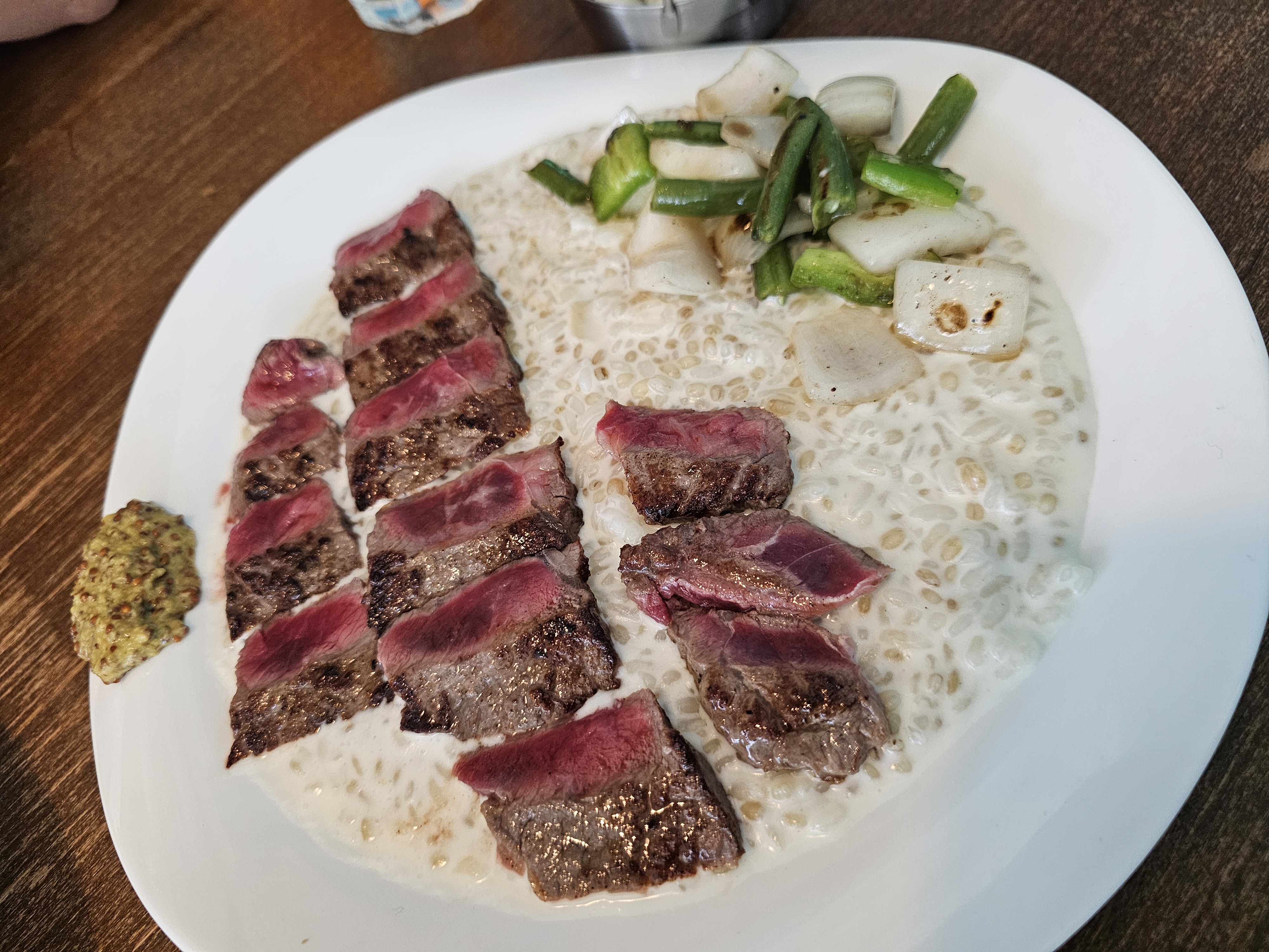 이날 주문한 메인은 '채끝 스테이크 보리 리소토'였어요. 보기에도 먹음직스러운 비주얼, 미디엄 레어로 구워진 스테이크는 부드럽고 육즙 가득! 아래 깔린 보리 리소토는 크림소스가 고소하면서도 쫀득쫀득한 식감을 주고, 마늘쫑과 양파, 겨자소스가 곁들여져 조화로운 맛을 완성해줍니다. 한 입 먹을 때마다 감탄이 절로 나왔어요.