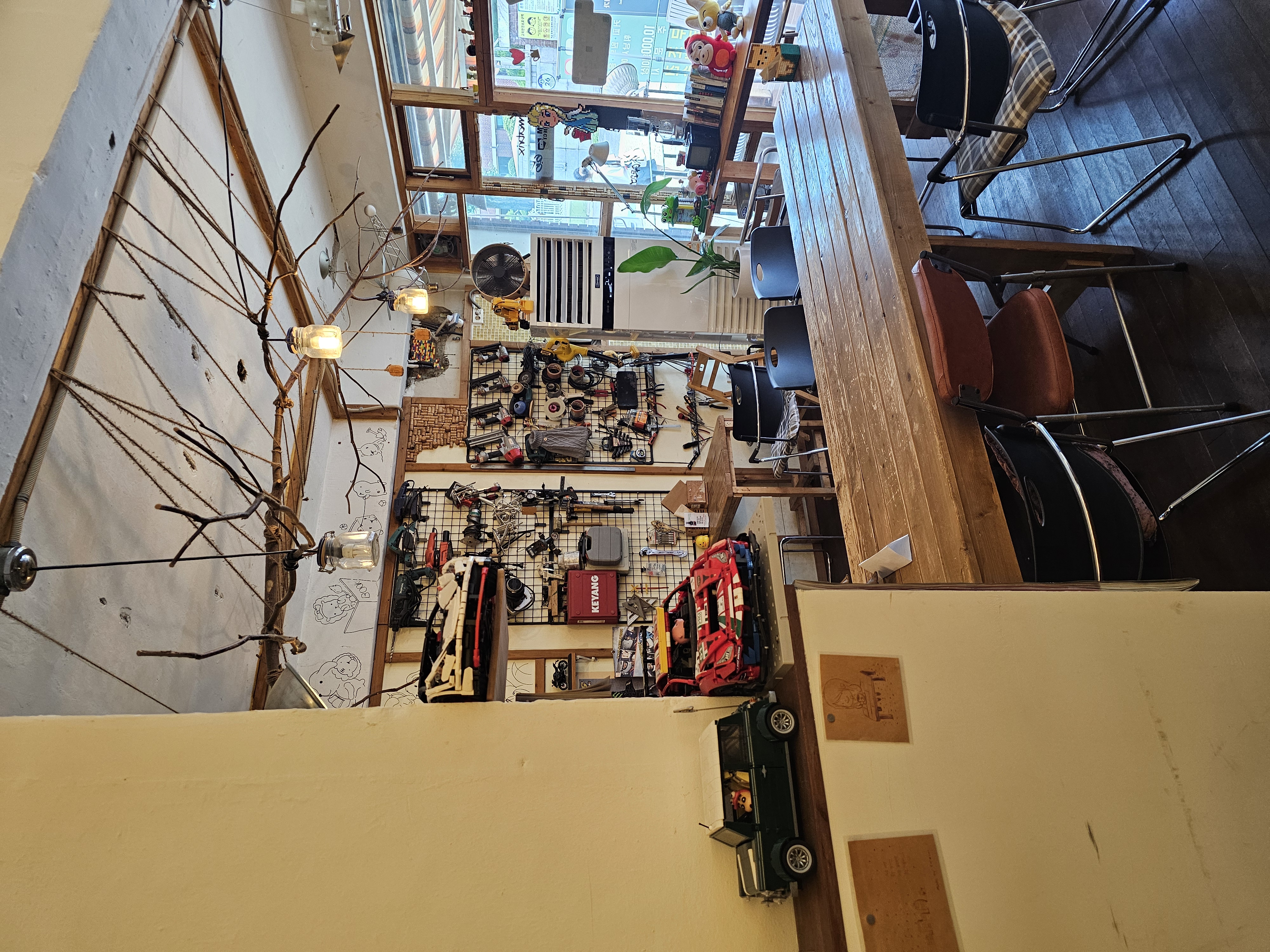 산책 후엔 '커피창고'라는 로컬 카페로 향했습니다. 외관부터 독특한 감성이 묻어나는 이 카페는 내부 인테리어가 정말 인상 깊었어요. 레고, 빈티지 장난감, 철제 수납장 등 각양각색의 소품들로 꾸며진 공간은 마치 누군가의 취향 가득한 작업실 같은 느낌이었어요.