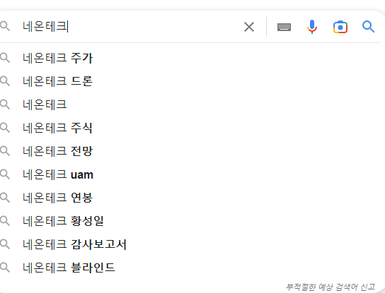 네온테크를 검색하면 드론이 검색어순위로 뜨는 것을 보면 대장주라는 것을 알수 있습니다.